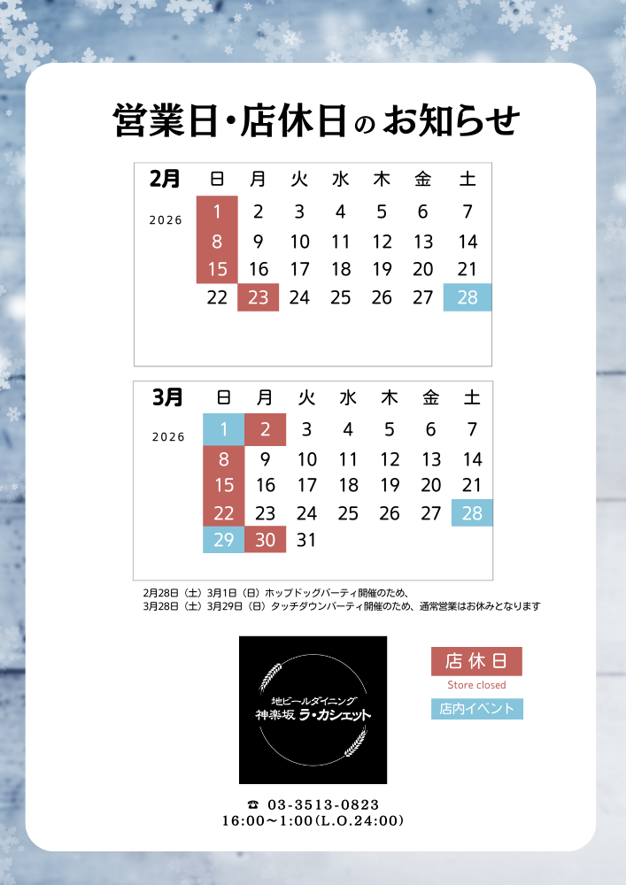1月24日(土)25日(日)2月28日(土)は店内にてパーティ開催のため通常営業はお休みとなります。